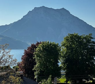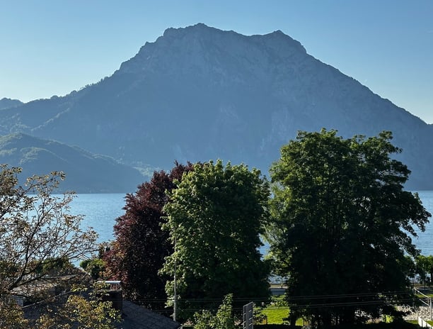 Vom Haus und Garten aus öffnet sich der Blick auf den Traunsee – tiefblau, ruhig und eingebettet zwischen den Bergen. Besonders eindrucksvoll ragt der Traunstein aus der Landschaft und verleiht dem Panorama seine unverwechselbare Silhouette. Die Luft scheint zu leuchten, das Licht verändert sich im Laufe des Tages – vom klaren Morgen bis zum warmen Abend. Diese Aussicht gehört einfach dazu. Ein Gefühl von Weite. Ein Stück Urlaub.